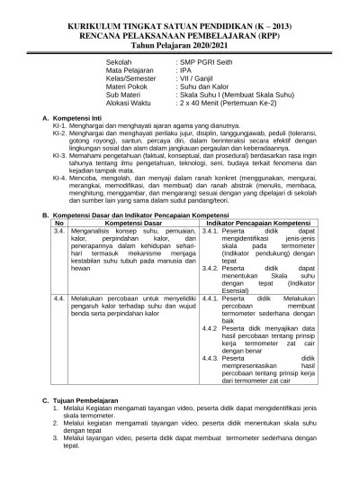 Perangkat pembelajaran merupakan suatu yang sangat . Rpp suhu dan perubahannya ini menggunakan pendekatan scientific,. Berikut ringkasan materi yang singkat padat dan jelas tapi tetap lengkap sesuai kurikulum k13 revisi terbaru. Pengetahuan alam kelas vii viii ix kurikulum 2013 revisi 2018. Suhu dan perubahannya merupakan salah satu materi ipa smp/mts kurikulum 2013. Pada kesempatan kali ini smpht.id ingin berbagi rpp 1 lemar smp/mts kelas vii kurikulum 2013 revisi 2021. Pembahasan soal ipa materi suhu dan perubahannya, kelas 7 smp semester 1. Shofia faridatuz zahra 28 september 2021, 17:00 wib. Sep 03, 2021 · pembahasan soal ipa materi suhu dan perubahannya, kelas 7 . Sifat fisika adalah sifat suatu . Materi suhu dan perubahannya diajarkan pada peserta didik kelas 7 smp/mts. Materi esensial pelajaran ipa untuk kelas 7 smp mts pada kurikulum 2013 (k13) edisi revisi 2016 terbagi dalam 12 (dua belas) bab. Zat cair yang paling banyak digunakan untuk mengisi tabung termometer adalah alkohol dan raksa.